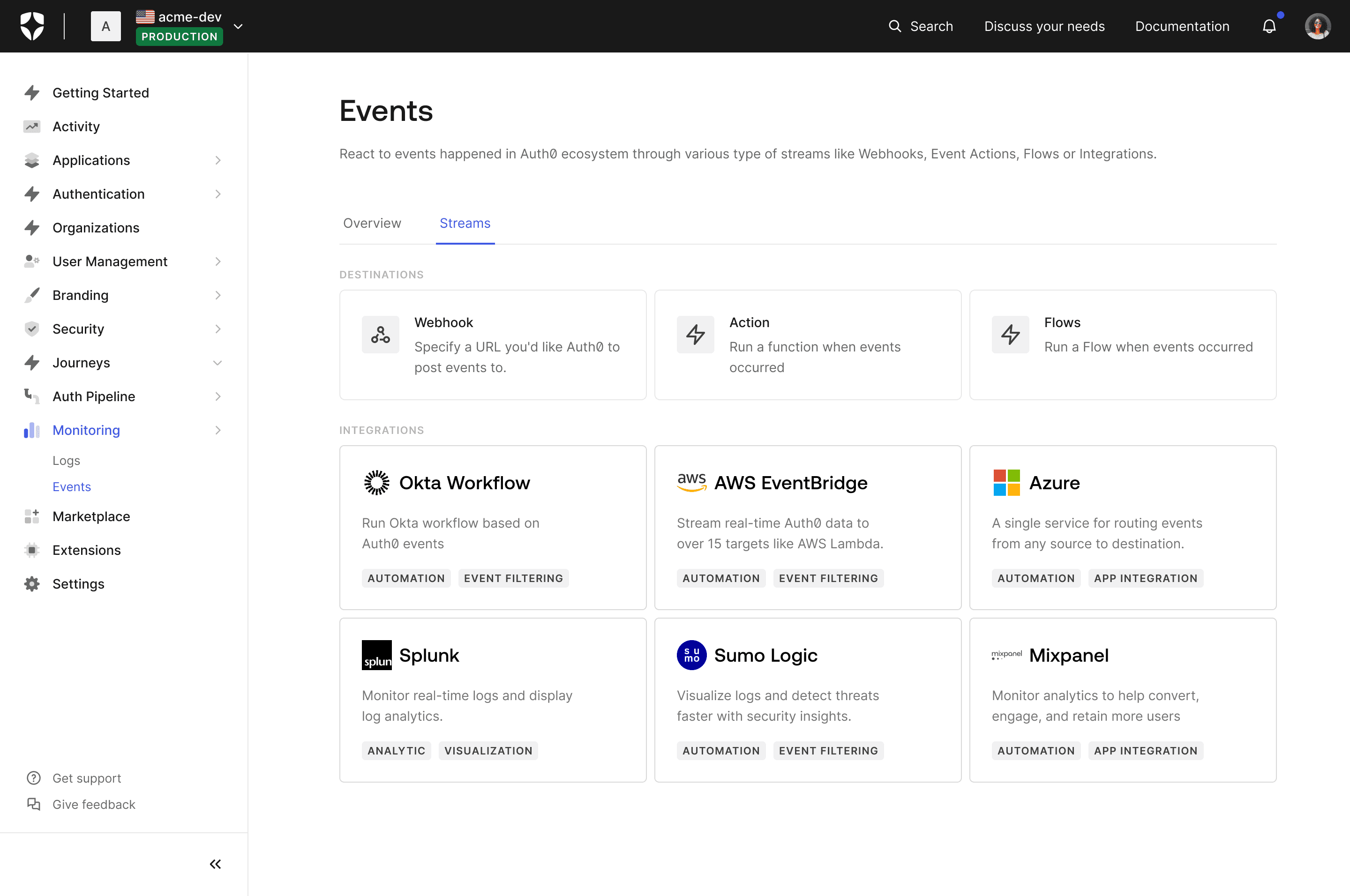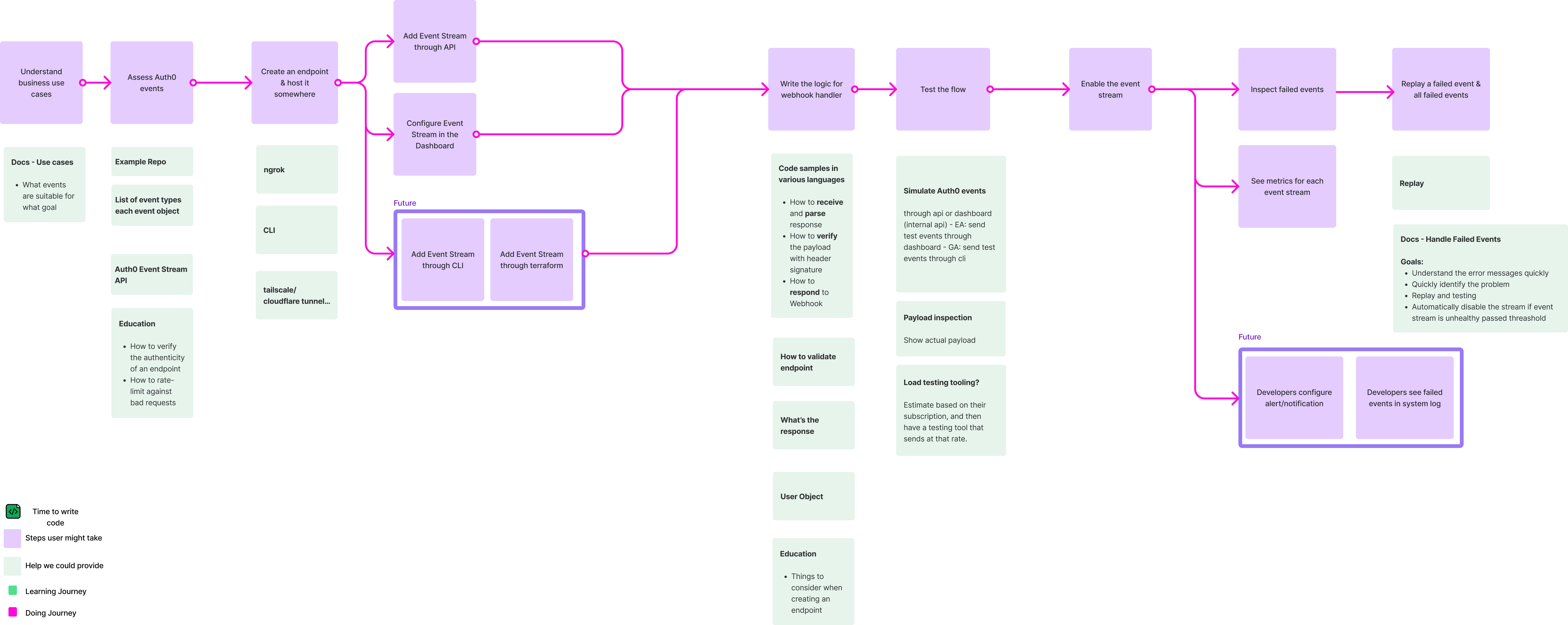 I designed a system of reusable patterns for stream creation, error handling, and event subscriptions, enabling customers to build real-time pipelines without needing custom code. The result was a more powerful, intuitive way for customers to operationalize identity data across their stack. They can finally react to events that take place in Auth0 and perform actions in their downstream systems.