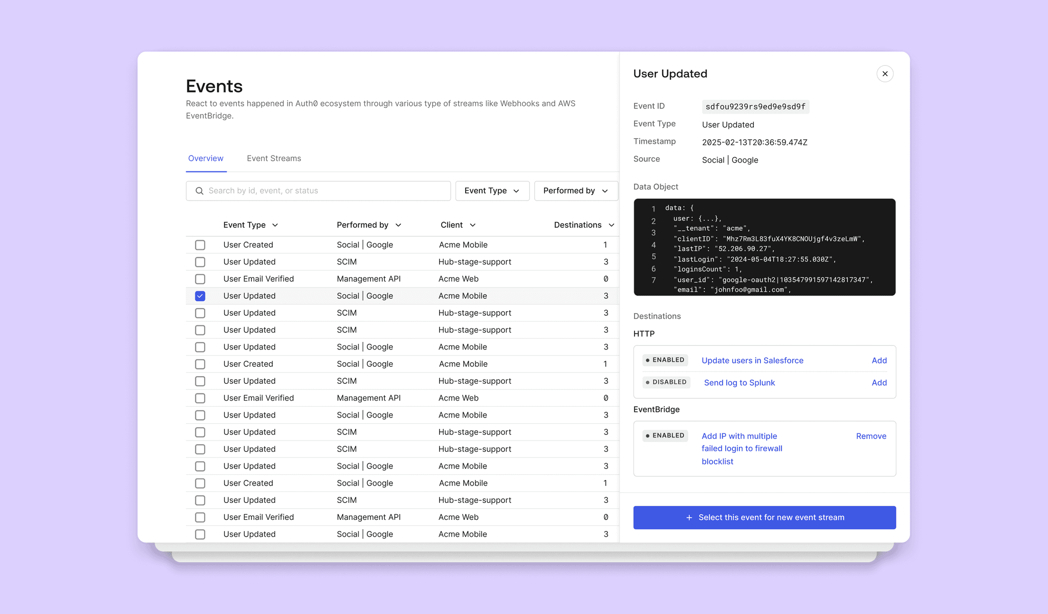 I led the product design for Event Streams, a new Auth0 capability that lets developers seamlessly pipe authentication and security events into external destinations like mailchimp, salesforce and observability tools like Datadog. My work focused on defining the end-to-end experience—from configuring connections to monitoring delivery health—while simplifying a highly technical workflow.
